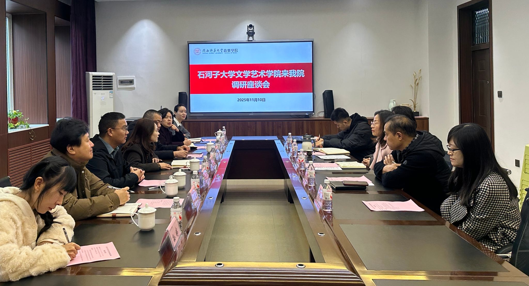11月10日上午,石河子大学文学艺术学院杜瑶副院长一行七人来我院调研。副院长张娟、韩晓勇、郭元、作曲与音乐学系主任宋超、舞蹈系主任郑璐参加座谈会。