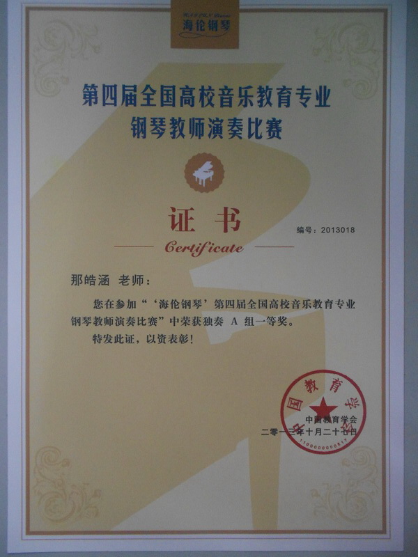 此次比赛全国有150多所高等师范院校500余名专业教师参加,竞争异常激烈。比赛内容有钢琴独奏、四手联弹、双钢琴演奏、歌曲即兴演奏四大项目。在钢琴独奏比赛中那皓涵以高超的演奏技巧、细腻精湛的情感处理,征服了在场的评委与观众,最终获得了金奖,为学校争得了荣誉。