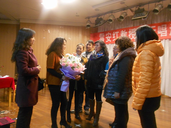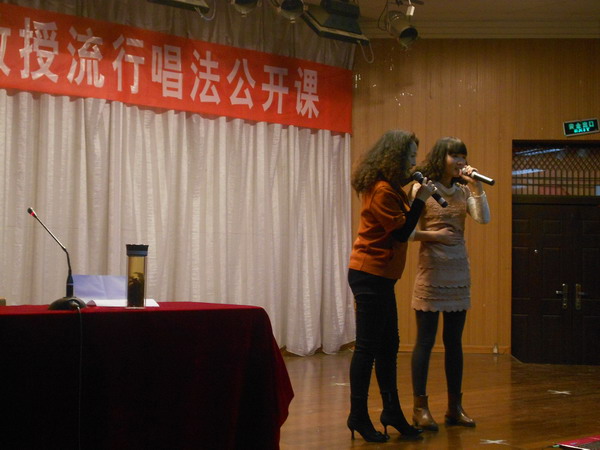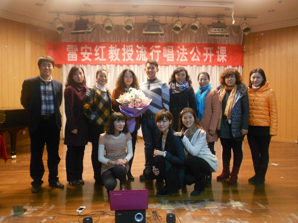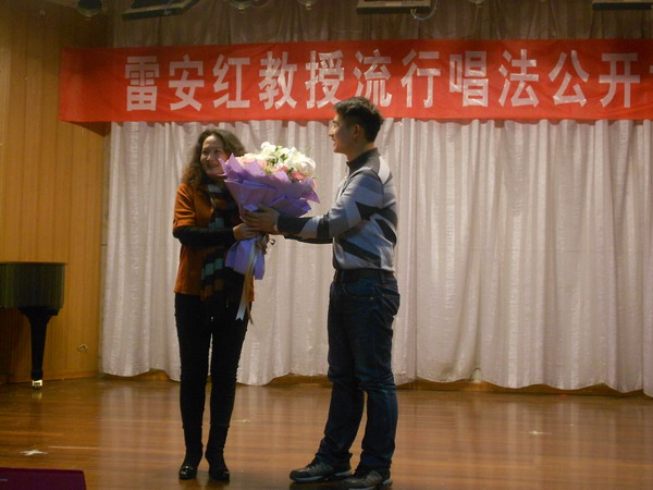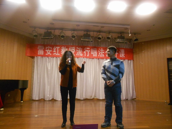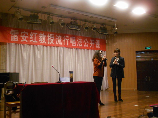 在近三小时的公开课中,雷安红分别给我院2011级免费师范生路婧、2012级钢琴研究生李小桐、2013级声乐研究生王潇进行了演唱指导,她讲了有关流行唱法的发声要领、演唱中应注意的一些常识性的问题,使在座的师生感触颇深。同时她又讲到了流行唱法声部音域的问题:“流行唱法女声声部与男中音同步,男声声部与男高音同样,使大家学到了流行唱法新的理论知识”。雷教授还讲到,流行唱法的声音支点需放在舌头的最中央、流行唱法的虚声是在实声的基础上产生的气声等等,她还强调了学习流行唱法的眼光要放眼全世界,要始终保持声音的独特魅力、个性,用声音的听觉、味觉、视觉、感觉、用心灵的隧道和心口一致去演唱。在互动的环节里,雷安红耐心回答了师生提出关于流行唱法的各类问题,如摇滚、爵士和普通唱法的区别等等,师生们对这些不同种类的流行唱法有了较明确的概念。公开课后,部分师生依依不舍的又和雷教授聊了很多目前关于流行唱法的发展与市场前景的需求等等问题。