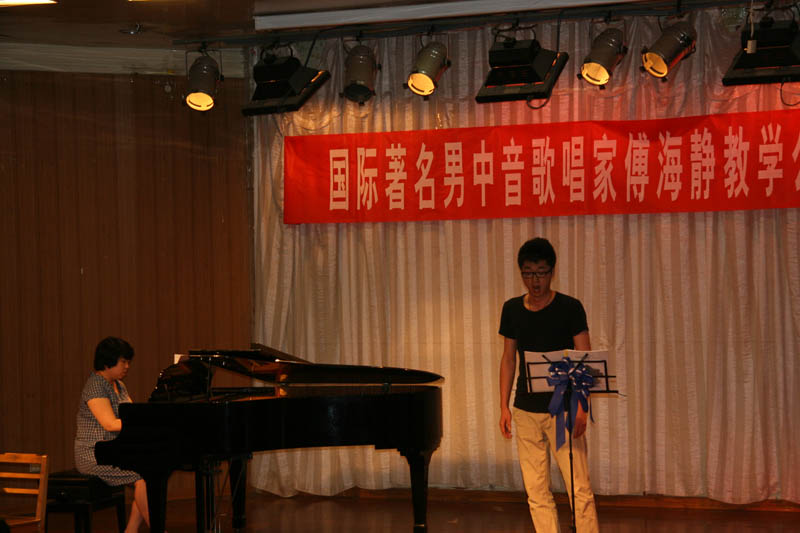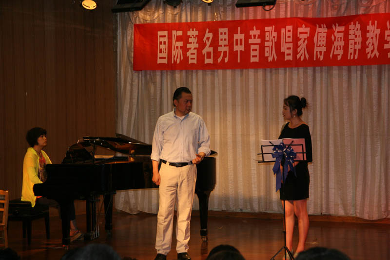 在接下来的教学示范课程中,我院5名不同年级的本科生、研究生进行演唱,傅海静教授对每一位学生都能够认真指导,具体说明其演唱中所出现的问题及表演方面的不足。在课程中,傅海静教授经常亲自表演示范,带领学生找到歌唱的感觉,并带动其演唱情绪,使学生能够快速找到表演感觉。傅海静教授幽默风趣的教学方式经常能引得全场爆发出一阵一阵的掌声,他语言诙谐但总能一针见血的指出问题所在,并以独特的方式引领学生找到正确的表演方法。在教学课程中,他指出真正的演唱者,应该从艺术表现的完整性上来诠释作品,而不是个别的高音点,在演唱时,要注重音乐的细节,并根据音乐的流动形态来随时调整自己的情绪。演唱者还需认真的揣摩原作品,要理解作曲家塑造的歌剧角色的音乐形象以及所要表达的意图等,并尽可能的将其还原,这样,才算是真正完成了一首作品的演唱!