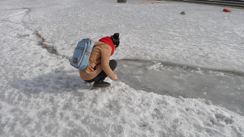 在严寒中捡拾垃圾