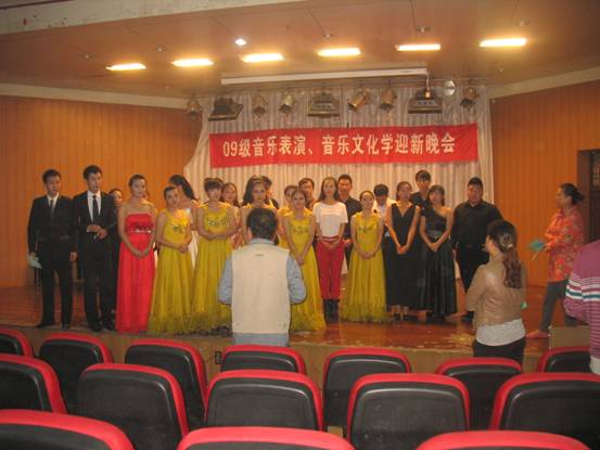 2012年10月7号晚7点半,我院2009级音乐表演专业、音乐文化学专业学生于六艺楼多功能报告厅成功举办了“09级音乐表演、音乐文化学班迎新晚会”,我院副院长程鹏民教授、王拥军副教授、张向侠副教授及我院教师李红梅、李亚云等莅临晚会现场并观看了演出。晚会充分向2012级入校新生展现了2009级同学们的热情与期待。晚会的精彩演绎博得了在场观众的阵阵掌声与好评,同时晚会各项工作的顺利进行也得到了在场领导、老师的认可和肯定。