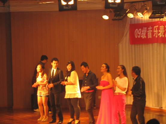 此次音乐会由我院领导提议、2009级音乐文化学专业策划并担任舞台指导最终由2009级表演班同学激情演绎。晚会由激情澎湃的独唱《节日欢歌》开场,该曲由金莹同学演唱、2009级6位女生同学自编自跳的伴舞烘托气氛,为晚会奠定了热情洋溢的基调;随后次序带来了古筝二重奏、管乐合奏、女声独唱、小提琴二重奏、流行歌、舞蹈等丰富多彩的演出节目,本场晚会可谓形式多样、内容精彩,演出过程中更是掌声叠起。