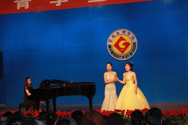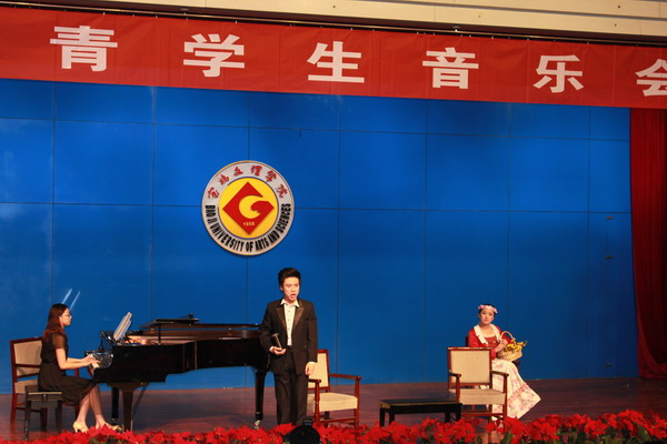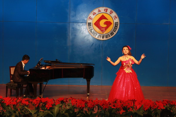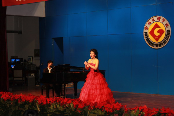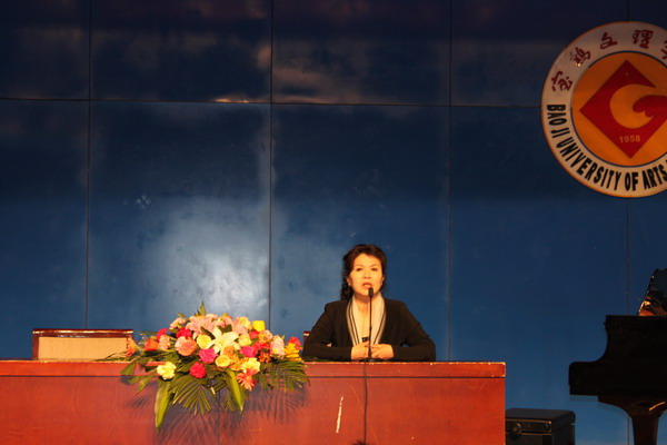 2012年4月12日,我院姚青副教授师生一行12人应宝鸡文理学院音乐系贺星主任的邀请,于当晚在宝鸡文理学院音乐厅举行了“姚青老师学生音乐会”,音乐会上同学们演唱了经典的中外歌剧咏叹调及艺术歌曲,男高音《为你歌唱》热情洋溢、《玛依拉变奏曲》绚丽的花腔、女中音浑厚的《哦,我的费尔南多》、《小路》、女高音《四周多么寂静》高难的技巧,他们的演唱赢得了师生们热烈的掌声,特别是歌剧《爱的甘醇》片段、俄罗斯歌剧片段《你从哪里滚回来了》其中的表演体现了同学们良好的专业素质、自如的舞台表现、娴熟的声乐技巧,得到宝鸡文理学院师生广泛的赞誉;展现了姚老师近些年声乐教学的观念、有效教学及良好的成效,既注重课堂、舞台、社会实践、声乐比赛系列声乐实践教学培养模式。