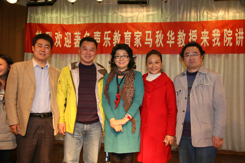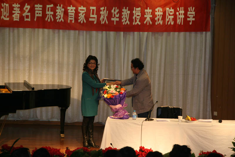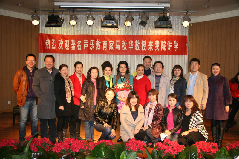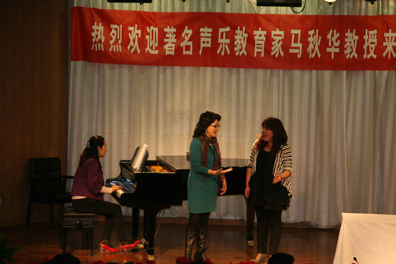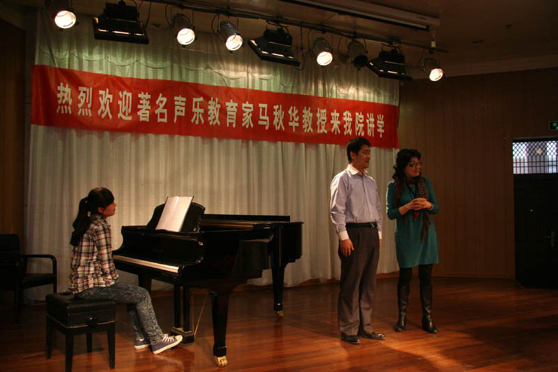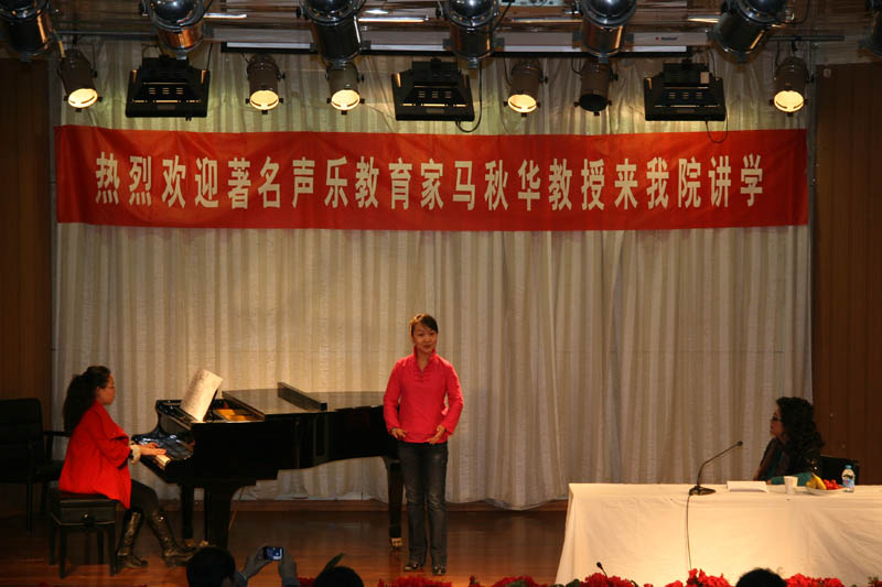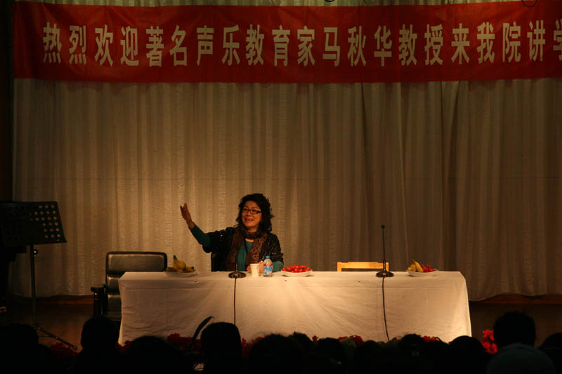马秋华教授在讲座中首先指出学生学习的兴趣是最好的老师,一个好的音乐家、歌唱家首先应从自己的兴趣开始,同时指出美声唱法学生一定要加强中国作品的演唱,民族和通俗唱法学生要借鉴中国各民族音乐的演唱风格和特点。马秋华教授还针歌唱者通常会犯到的错误以及如何把握正确的歌唱状态,从科学性、民族性、文化性、时尚性四个方面进行了系统的、生动的阐述。