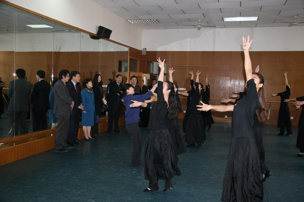 田大成院长陪同全泰东总领事及夫人参观了我校终南音乐厅和我院汉唐乐器陈列室。在终南音乐厅,田院长结合我院与日本东京艺术大学合作演出歌剧《卡门》、《阿依达》的实际情况详细介绍了音乐厅的功能及设施水平。在汉唐乐器陈列室,我院副教授逐一介绍了仿战国瑟、仿唐九品月琴、仿唐花边大阮、秦琴、仿唐葫芦琴、奚琴、仿唐十三弦筝、彩绘羯鼓、敦煌壁画齐鼓、仿唐尺八等珍贵乐器。随后,全泰东总领事及夫人还观摩了我院芭蕾基训、民族民间舞教学,进一步加深了对我院办学情况的了解并予以充分的肯定。