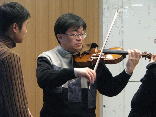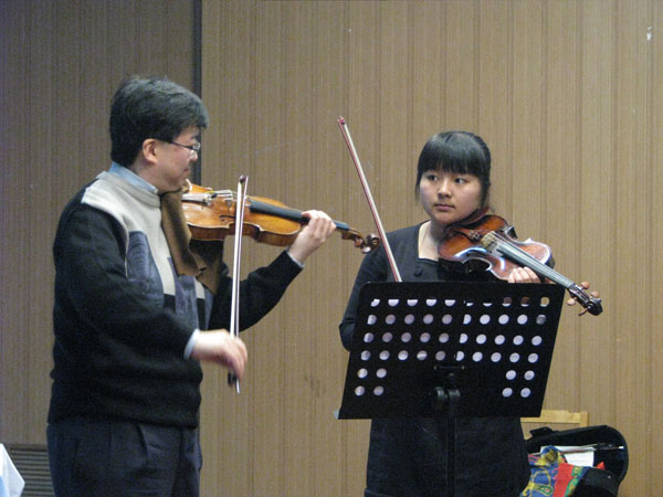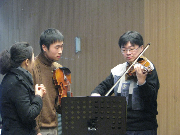 30日晚,松原胜也副教授作为我院特邀嘉宾,特别为我校交响乐团成立纪念晚会带来了三首独奏曲目《爱的祝福》《无伴奏小提琴小奏鸣曲》《流浪者之歌》,现场师生都为他精彩的技艺所折服,为他报以了最热烈的掌声。31日上午,松原胜也副教授在六艺楼报告厅为我院小提琴专业的学生进行了现场授课。王旸、央金、刘青等六位同学先后得到了松原胜也副教授的现场指导。松原胜也副教授从同学们各自不同的特点出发,针对他们所选择的作品背景、作品风格和特点等方面耐心的讲解,在讲到对作品的处理细节上更是亲身示范,让同学们对作品有了更直观、更深刻的理解。同学们通过大师课的学习,对自身的演奏技巧和对作品的理解上都有了更深的认识和提高。