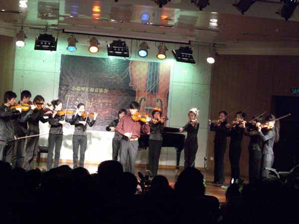 音乐会开场于亮老师带领小提琴专业全体学生合奏了一首大家耳熟能详的《很久很久以前》,接着是于亮老师和学生王旸、央金合奏的《爱的致意》,观众一开始已经陶醉在小提琴轻盈浪漫的琴声中。接下来是学生们的一组独奏,分别由宋扬、刘青、郭青、央金、王旸表演,观众们对学生们精彩的演出爆发出一阵阵掌声,现场气氛十分热烈。听完了学生们的汇报曲目,下面的《菊花台》将音乐会推向了另一个高潮。小提琴、古筝、钢琴为《菊花台》作出了新的诠释,迎着渐暗的灯光走向前台的是舞蹈专业中专班的小姑娘们,观众们为现场的演出惊叹不已。最后,于亮老师带领学生们又合奏了一曲《D大调卡侬》,让人们再次为小提琴所传出的琴声魅力所折服。主持人在音乐会结束之际邀请于亮老师即兴表演了两首曲目,于亮老师精彩的表演为此次音乐会画上了一个圆满的句号。