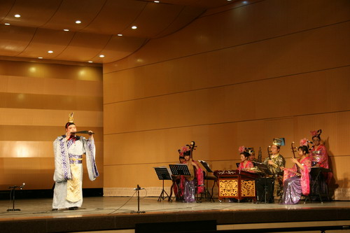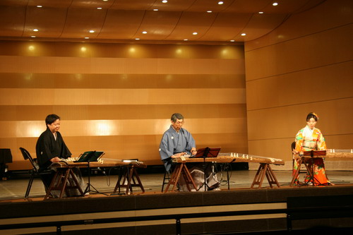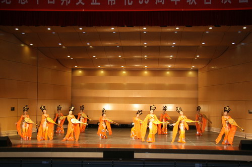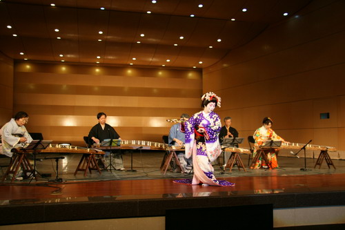 古筝演奏家我校曲云教授作曲并演奏的《香山射鼓》以西安鼓乐为素材,生动地描绘出陕西关中地区一年一度的香会朝山盛况;张晓农教授以一曲中国古代经典琴歌《关山月》表达了反对战争、渴望和平之意;程鹏民教授根据敦煌壁画《伎乐天》创作的舞蹈《妙音反弹》,则将人们带入飞天起舞、天乐妙音荦绕耳际的境界。中国艺术家精彩的表演,赢得日本音乐家的高度评价。