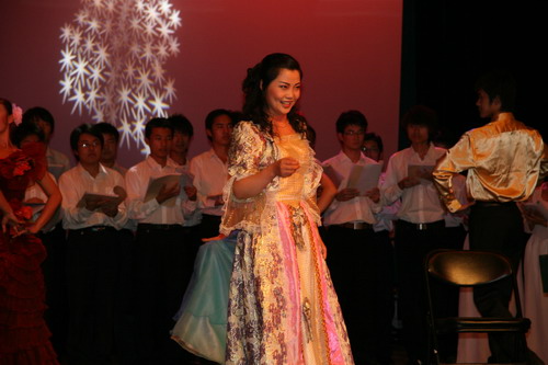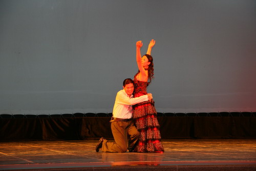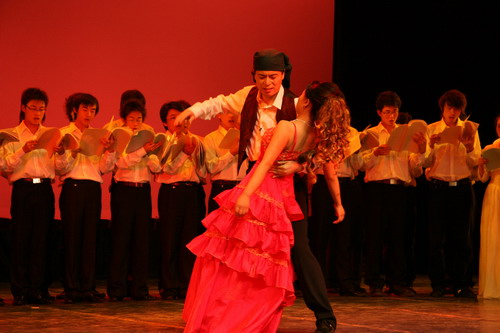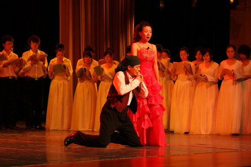 距离演出开始还有半小时时,可容纳千余人的终南音乐厅里已座无虚席,虽然已临近期末考试阶段,但《卡门》仍然吸引了来自不同院系、不同专业的师生前来观看。19:30分,演出在《卡门序曲》中拉开帷幕,由舞蹈系学生表演的热情奔放的西班牙舞蹈将演出推向第一个高潮,随后唱起的熟悉的《斗牛士之歌》赢得了全场热情的掌声,唐霍赛倾吐爱情的《花之歌》以及整部作品的最高潮——盛怒之下的唐霍赛刺死卡门更是感动全场观众。第四幕里卡门倒在唐霍赛的利剑之下,全场演出结束,音乐厅里响起长长不息的掌声,指挥、演员、钢琴伴奏在观众热情的掌声中一一谢幕。