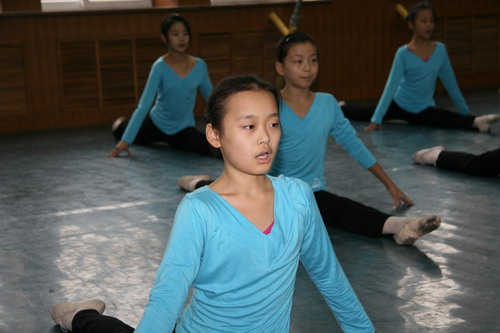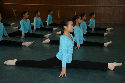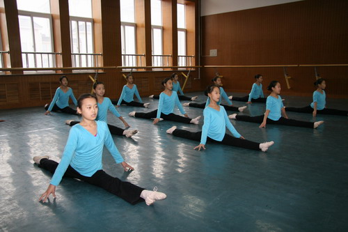 昨日,365英国上市网舞蹈中专部一年级的学生在练功间隙,十几个学生保持着劈叉的动作,背起了《大学》。