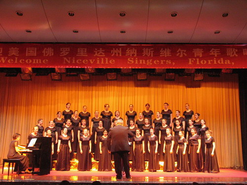 美国佛罗里达州纳斯维尔青年合唱团于1990年在指挥麦克尔-戴的倡导下组建。歌唱团为有歌唱天赋的学生提供了在课余时间参加混声合唱的机会。2006年5月30日晚,与我院学生,在积学堂,联合演出了一场别具特色的合唱音乐会,主要曲目有:美国民歌 《哦 苏珊纳》O Susannah、The Mighty Theme 《强大的小老鼠》、Red River Valley 《红河谷》、It’s a Grand Night for Singing 《今晚是歌唱之夜》等。风趣、活泼的表演给观众留下了深刻的印象。