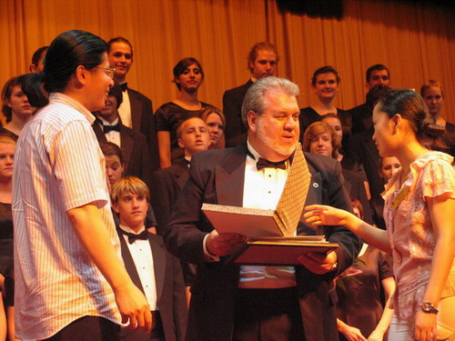 此次合唱音乐会不仅促进了中美之间的音乐文化交流,学习并借鉴了美国合唱团在演唱技巧、演唱风格等方面的优点,同时也为我院合唱团在经后更好的发展,积累了宝贵的经验。演出结束后,我院院长田大成教授代表我校全体师生向玛丽爱特室内合唱团和纳斯维尔青年合唱团分别赠送了礼物,以表谢意。并指出,音乐是不分国界的,在音乐的呵护下,我们彼此的友谊会更深。更远。