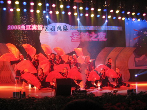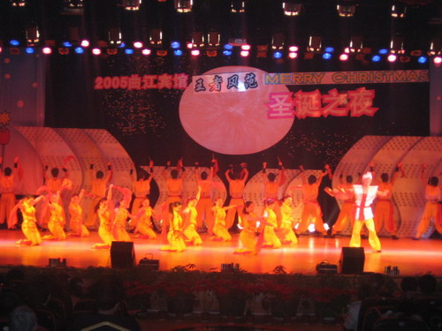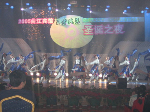 12月24、25日晚,“2005曲江宾馆王者风范圣诞之夜”大型晚会在曲江宾馆演出。应曲江宾馆组委会的邀请,我院舞蹈系在这两场晚会中承担了所有的舞蹈及伴舞演出表演。此次的演出,展示了我院的艺术风貌,为我院在社会中赢得了良好的影响。