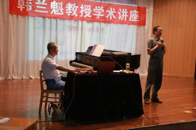 此次讲座由张新梅副院长主持,张新梅首先向在场师生对韩教授简介,结合自己学习经历讲述了韩教授作品影响之深远。随后,韩教授上台为大家作详细报告。他首先强调西北历史文化对于自身创作影响很深,从音乐文化学、音乐地理学角度来说,西安都具备广阔的研究与参考空间。接着,韩教授分享了自己的创作观念,总结出“作曲四大件”,即对经典作品的分析能力、对民族民间音乐的占有量、对近现代作曲技法与化解能力、对真善美的崇尚,并强调“创作不能轻易丢弃自己的风格”这一重要理念。最后,根据理论讲授,韩教授结合实际为大家介绍了自创的四部作品:西洋交响乐《丝路断想》、民族管弦乐《月牙泉的故事》、童声合唱《朱鹮你好》及声乐独唱《送你一个长安》,他以钢琴演奏及音视频播放的形式,结合每一部作品进行作曲技法及创作思路解读,为大家深入了解作品提供了直观感受。