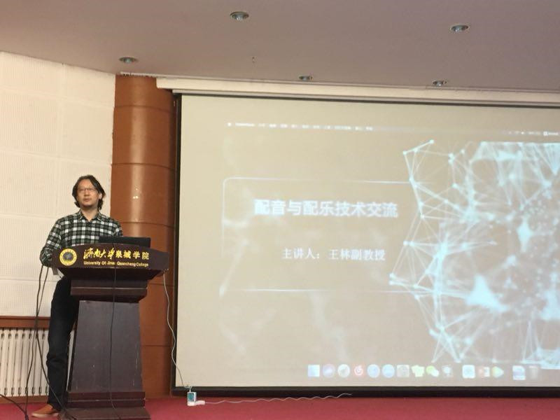 2018年12月21日,我院王林副教授受邀赴济南大学泉城学院举行了配音与配乐技术相关讲座。出席本次讲座有济南大学泉城学院曲洪启院长、郭敏霞副院长、音乐教研室相关教师及学生700余人,讲座由郭院长主持。