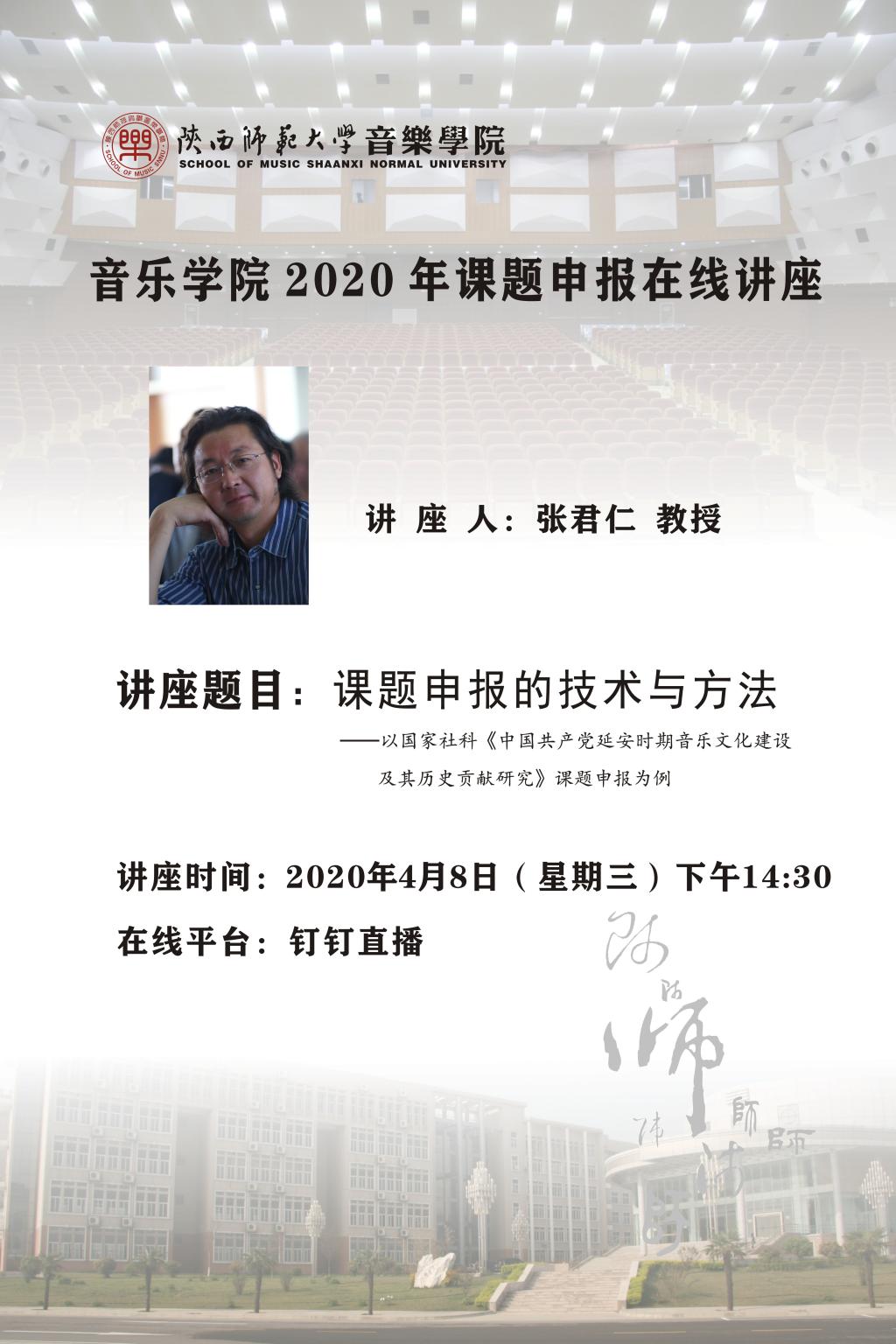 在线讲座预告:课题申报的技术与方法——以国家社科《中国共产党延安时期音乐文化建设及其历史贡献研究》课题申报为例(主讲人:张君仁教授)