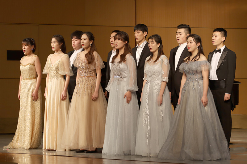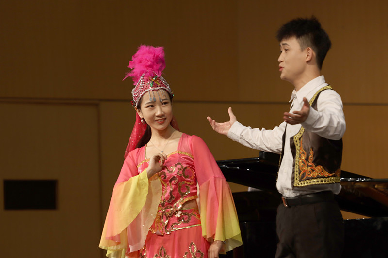 多彩中国篇。男女对唱《黑眉毛的姑娘》、女生小合唱《南泥湾》、男生合唱《弹起我心爱的土琵琶》将音乐会推向了高潮,同学们的热情表演唱,把这种轻松喜悦传递给了观众。民歌联唱的最后一首歌曲《玛依拉变奏曲》由贾茹老师演唱的哈萨克族民歌,歌曲轻松欢快,结束了第二篇章。