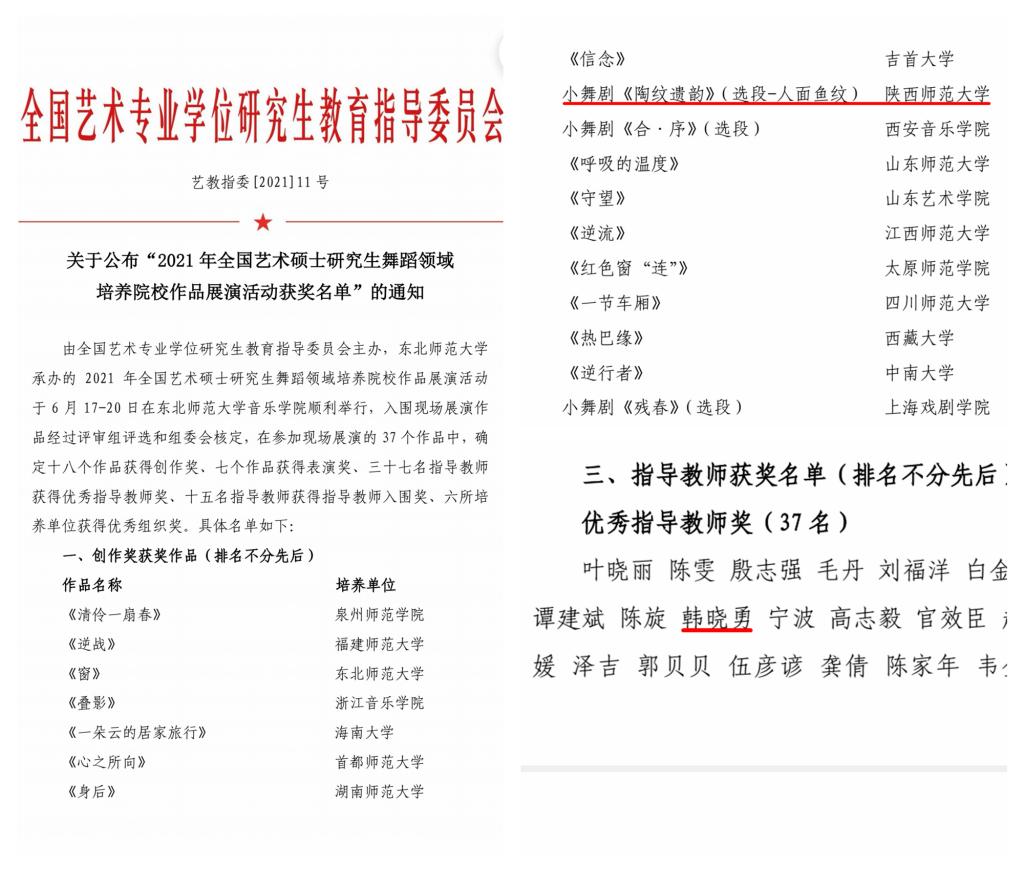 近日,我院艺术硕士研究生原创小舞剧《陶纹遗韵》(选段-人面鱼纹)在全国作品展演中荣获“创作奖”,指导教师、副院长韩晓勇副教授荣获“优秀指导教师奖”。本次艺术硕士作品展演活动由全国艺术专业学位研究生教育指导委员会主办、东北师范大学承办。