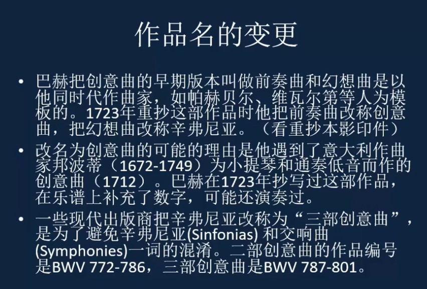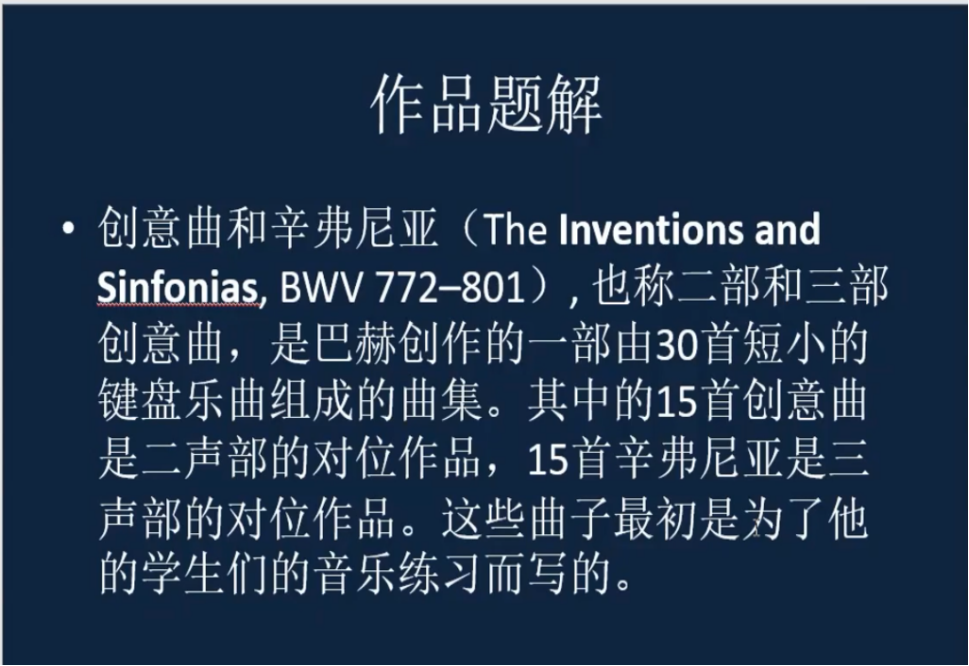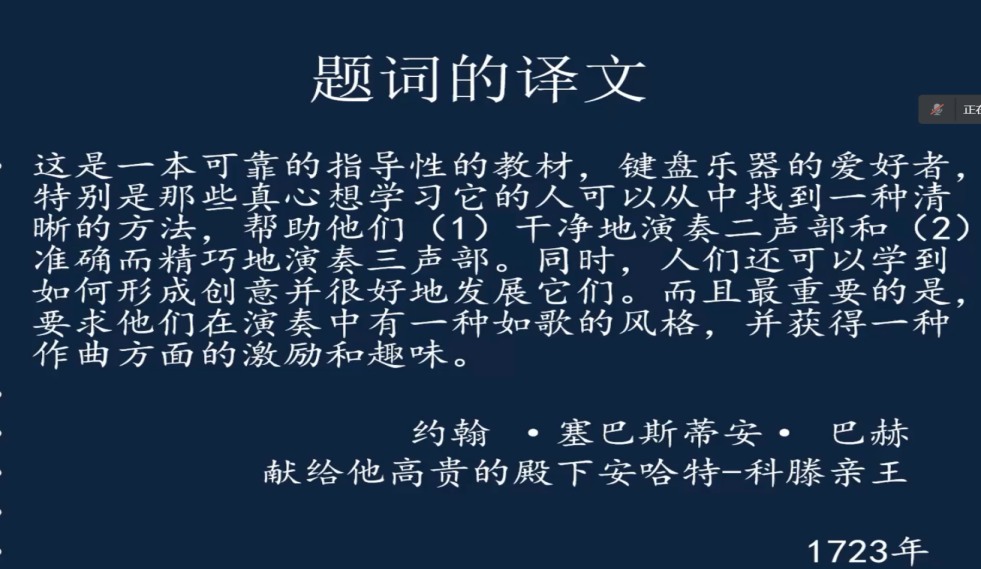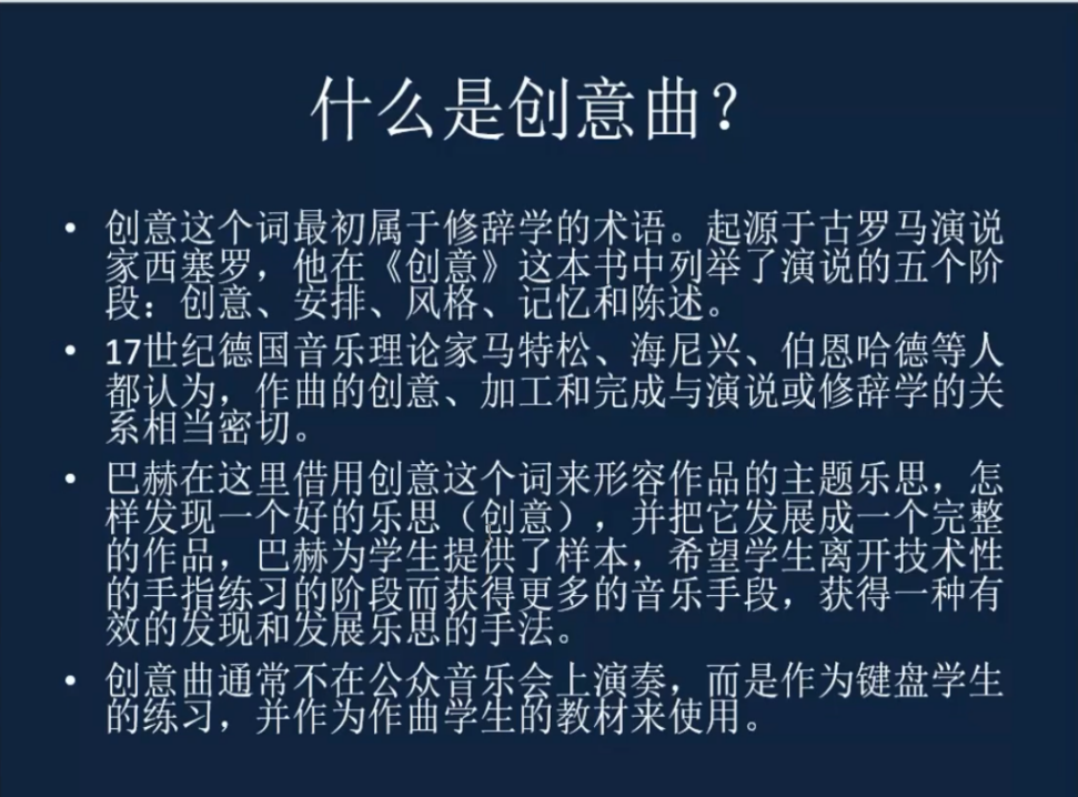 首先,余老师对巴赫的创作背景与作品进行介绍,并且解释“创意曲”这一体裁的词源,说明巴赫创作的规律性。