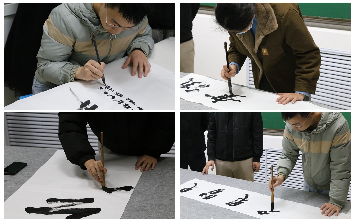 随后,师生共同完成了毛笔字、钢笔字和粉笔字书写。仝昊用秦隶书写了“见贤思齐”“敬事”与大家共勉,同时向在场师生介绍了从秦篆到秦隶的演变。写毛笔字的同学或行云流水,或入木三分;写粉笔字和钢笔字的同学通过誊写党的二十大报告原文、习近平总书记对青年的寄语以及关于教育的重要论述,在练字的同时,学习贯彻党的创新理论,增强“四个意识”、坚定“四个自信”、做到“两个维护”。
