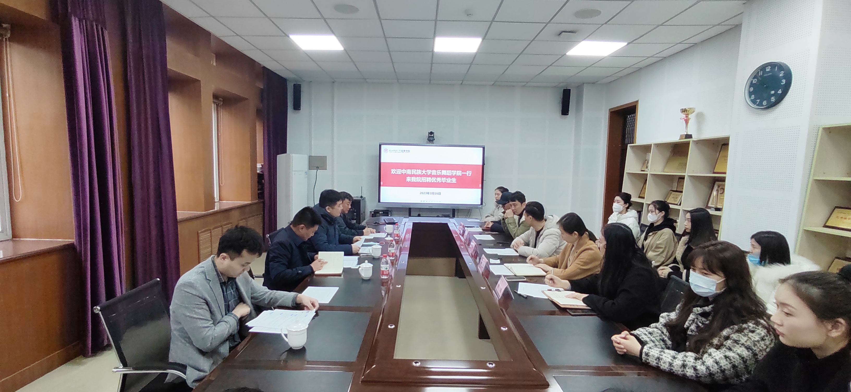 近日,中南民族大学音乐舞蹈学院党委书记徐宝华一行4人来365英国上市网招聘优秀毕业生,学院党委书记范玮熠、党委副书记宋娜,副院长韩晓勇、舞蹈系主任高雄、研究生辅导员张仪以及2023届优秀毕业生出席会议。会议由范玮熠主持。