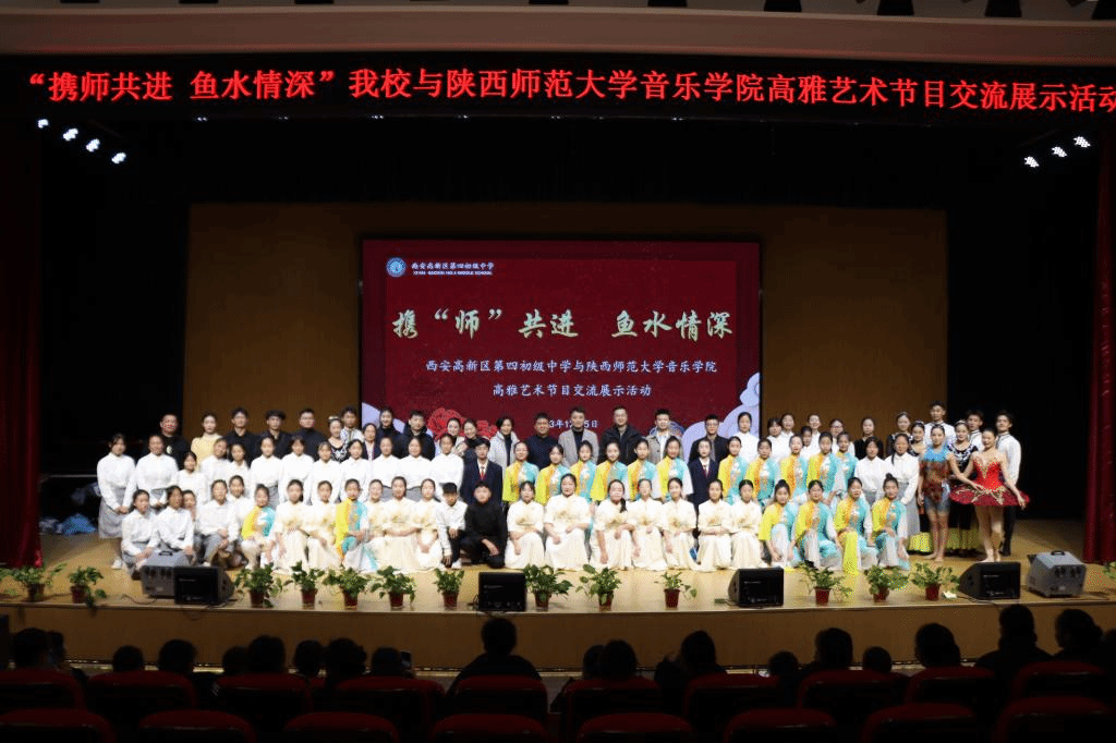首先,学院学生代表与高新第四初级中学学生共同完成了一台丰富精彩的艺术交流展演,展示了学生的艺术风采。随后学院与高新第四初级中学举行了音乐舞蹈教育见习实习研习基地授牌仪式,旨在增强我院与实践基地协同育人功能。最后,高新第四初级中学张姝浛老师与胡楚銮老师为我院学生进行音乐学科教育教学以及社团带团训练比赛经验分享,同学们对音乐课堂的教学设计及社团组织有了更加清晰的认识。