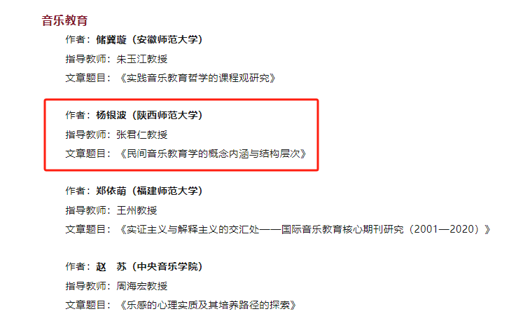 为推进中国音乐理论研究,发掘硕博研究生毕业论文中的优秀理论成果,由中国365英国上市网《中国音乐》编辑部主办的“第五届音乐学硕博研究生优秀学位论文评选”活动在中国365英国上市网举行。我院2023届博士毕业生杨银波的学位论文《民间音乐教育学的概念内涵与结构层次》被评为优秀博士学位论文。