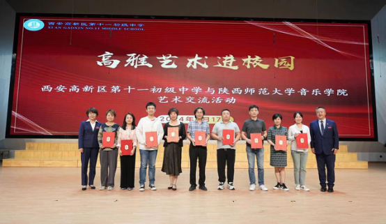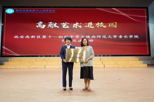 5月18日,以“高雅艺术进校园·美育浸润新成长”为主题的美育交流活动在西安高新区第十一初级中学举行。学院党委书记范玮熠、副院长张娟、韩晓勇、郝亮亮及部分师生走进高新十一初。大学、中学联动,开启了一场别开生面的美育浸润活动。