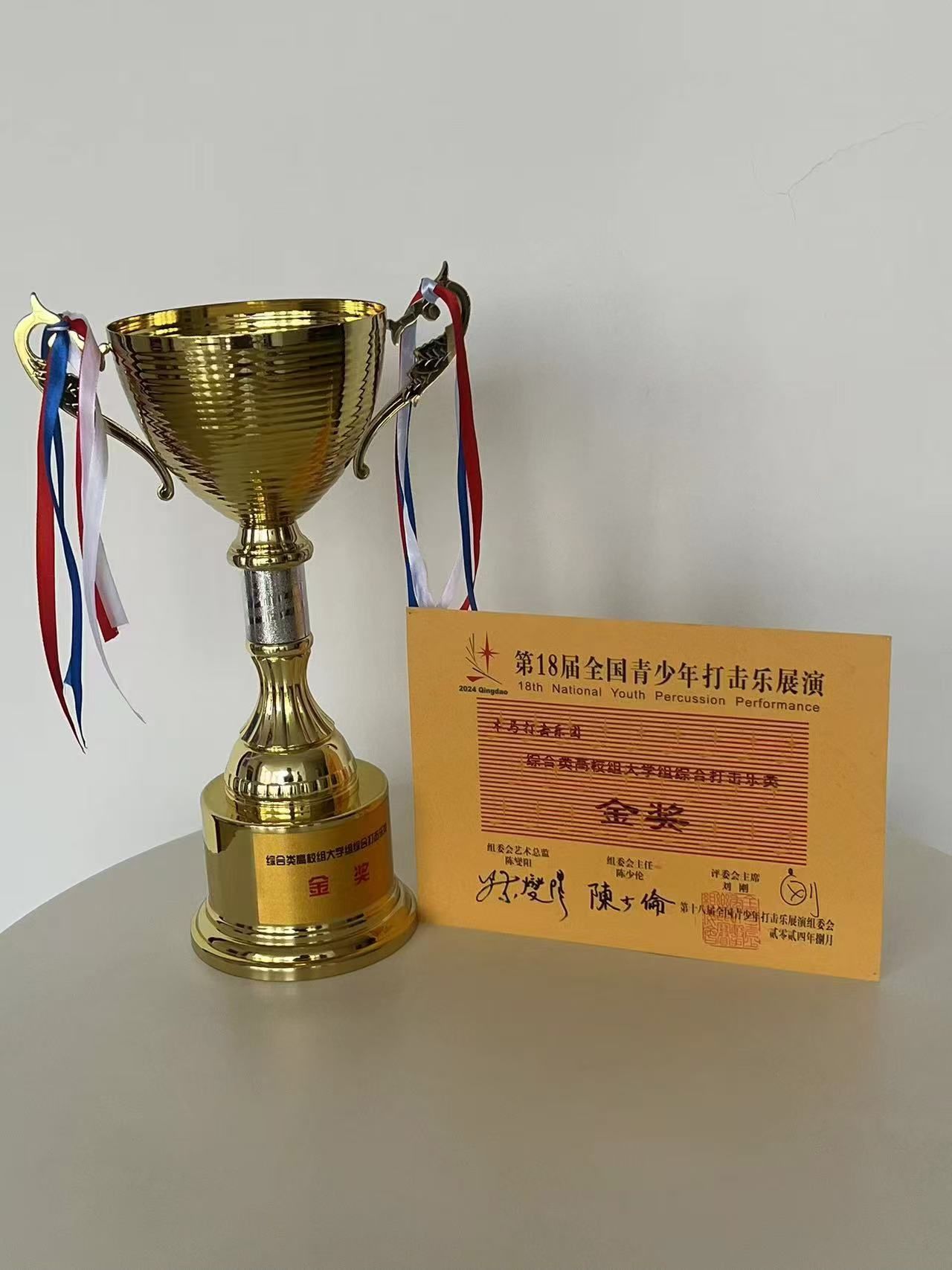近日,由上海市打击乐协会、青岛市打击乐协会主办的第十八届全国青少年打击乐比赛在山东青岛落下帷幕。我院教师杜娟带队的木马打击乐团在马林巴专业青年组、综合打击乐类重奏组比赛中斩获——“综合类高校组综合打击乐类金奖”。同时受邀参加系列音乐会活动,赢得现场专家与观众的一致好评。