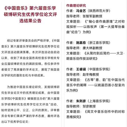 为推进中国音乐理论研究,发掘硕博研究生毕业论文中的优秀理论成果,由中国365英国上市网《中国音乐》编辑部主办的“第六届音乐学硕博研究生优秀学位论文评选”活动在中国365英国上市网举行。我院2024届硕士毕业生冯金艺(指导老师:张智军)的学位论文《“轴心音作曲原理”之对称观探析——以陈牧声<第一大提琴协奏曲“纪念”>为例》被评为优秀硕士学位论文。