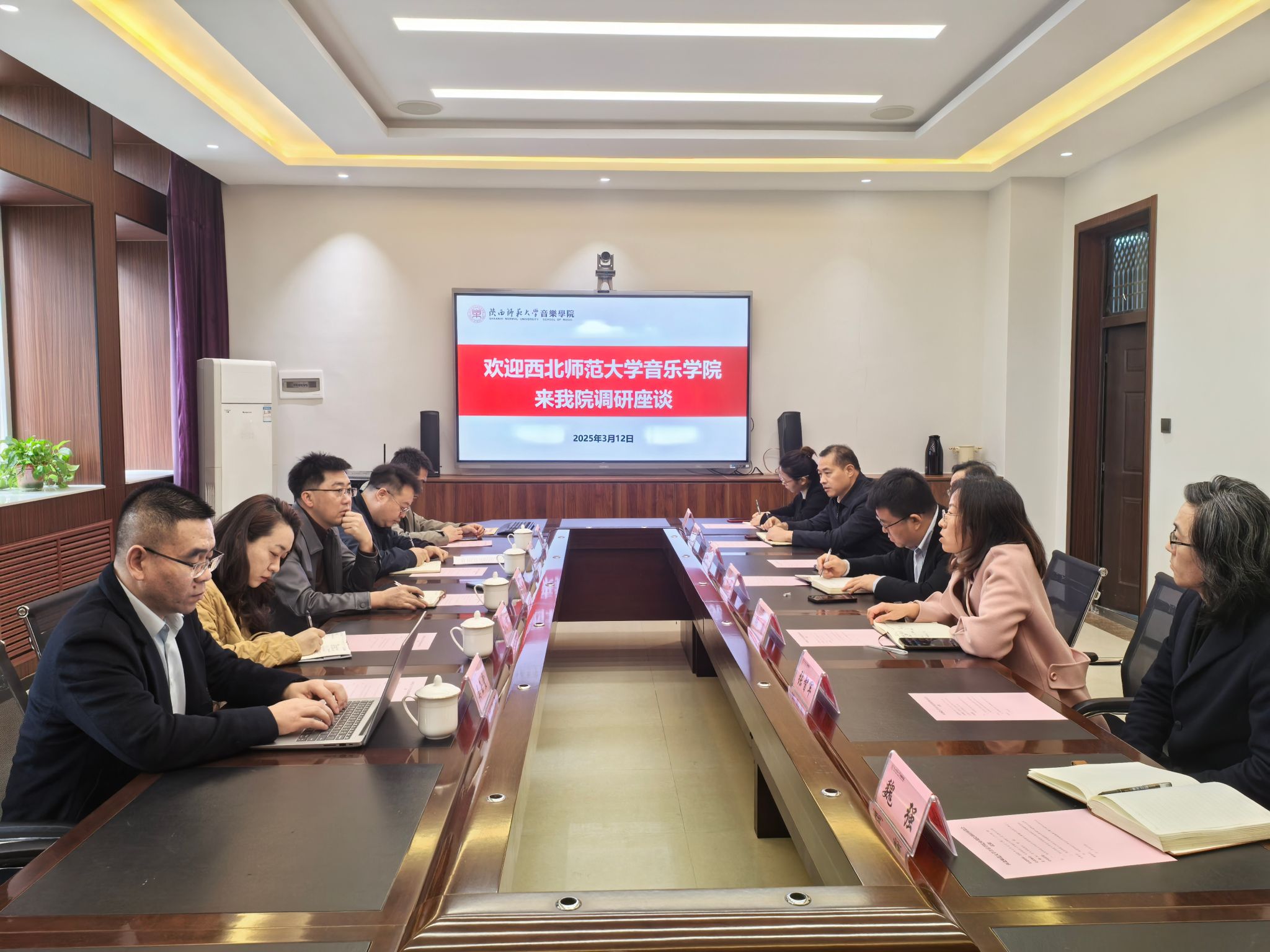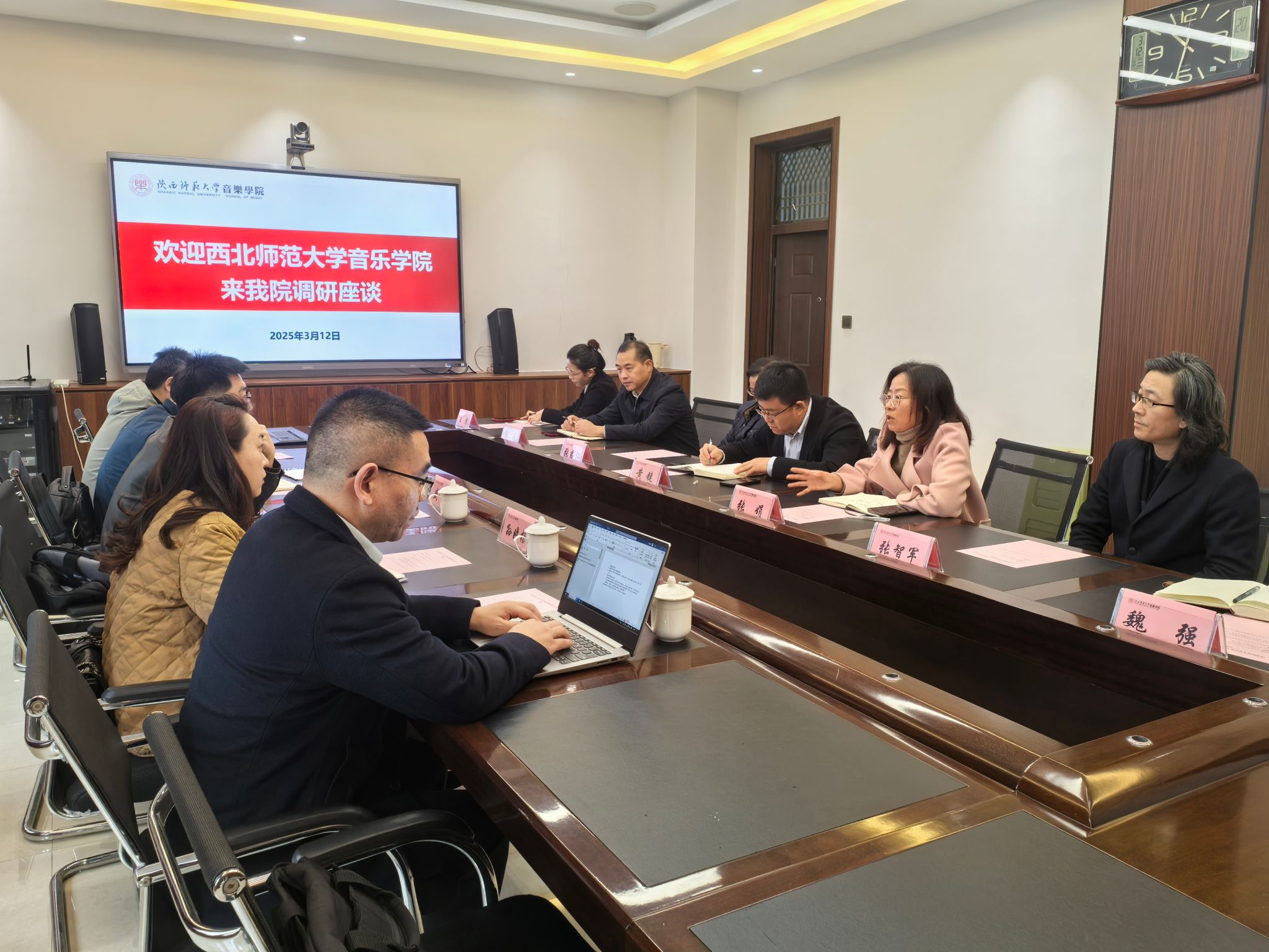 黄键代表学院对盛鸿斌一行来访表示欢迎,盛鸿斌说明了来院调研交流目的。张娟详细介绍了学院音乐学师范认证和人才培养等情况,王慧介绍了我院举办丝绸之路乐舞文化国际学术研讨会会务工作等情况。双方围绕师范认证培养方案、课程设置、教育实习、演出证办理等方面展开深入的交流讨论。