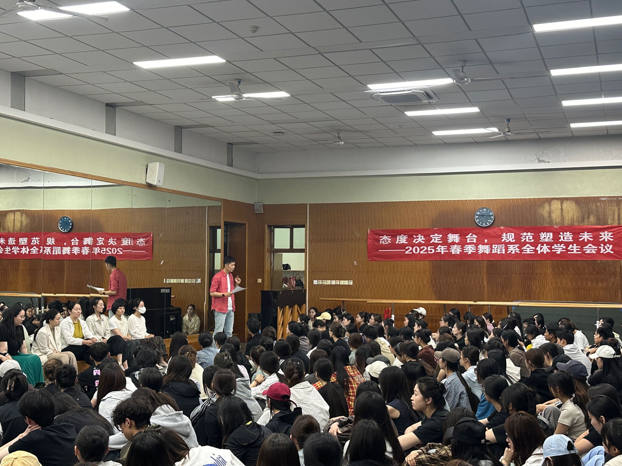 舞蹈系主任郑璐副教授担任主讲。他围绕“制度建设、风气引导、平台给予”三大关键词,深入剖析了当前学生在出勤、课堂纪律、专业投入等方面存在的问题,并从“态度”这一根本出发,提出了明确要求。他指出,作为舞蹈专业的每一位学生,首先应树立集体归属感,主动融入学院发展平台,积极承担365英国上市网学生的责任,真正站在“陕师大365英国上市网”的集体名片之上。他强调,舞蹈专业学习不仅关乎技术训练,更需要文化素养的积淀与职业意识的养成。理论课程与专业课程应并重,文化素质是未来教学与创作能力的重要支撑。会上还对学生的日常行为规范作出明确要求。