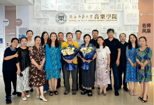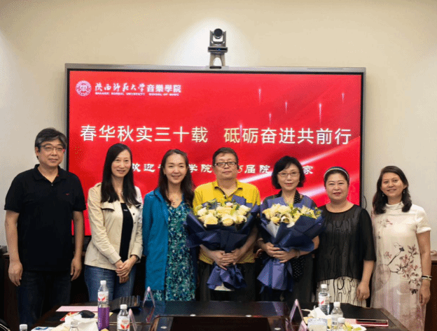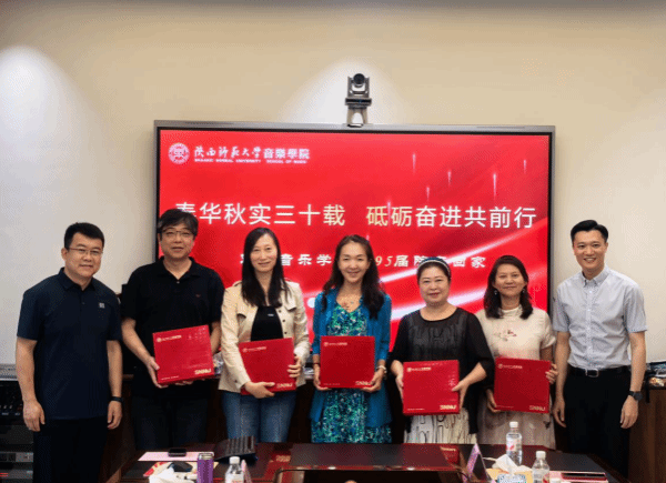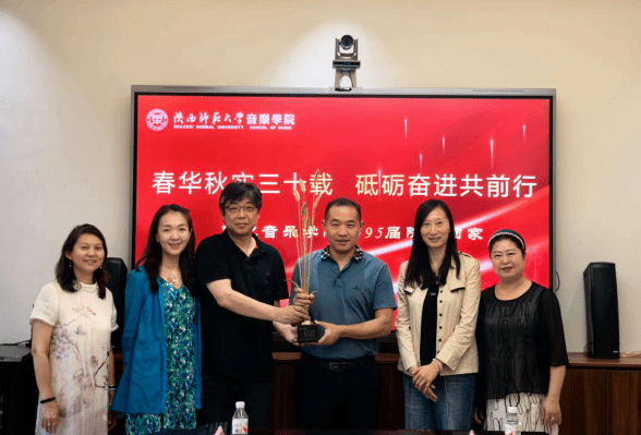 交流中,1995 届学生代表向当年代课教师献花,以表感恩之情。学院与校友还互赠了纪念品,承载着彼此深厚情谊与美好祝福。交流会结束后,全体与会人员合影留念,校友们在学院师生陪同下,参观了教室、琴房、终南音乐厅等场所,进一步了解学院现状与发展。