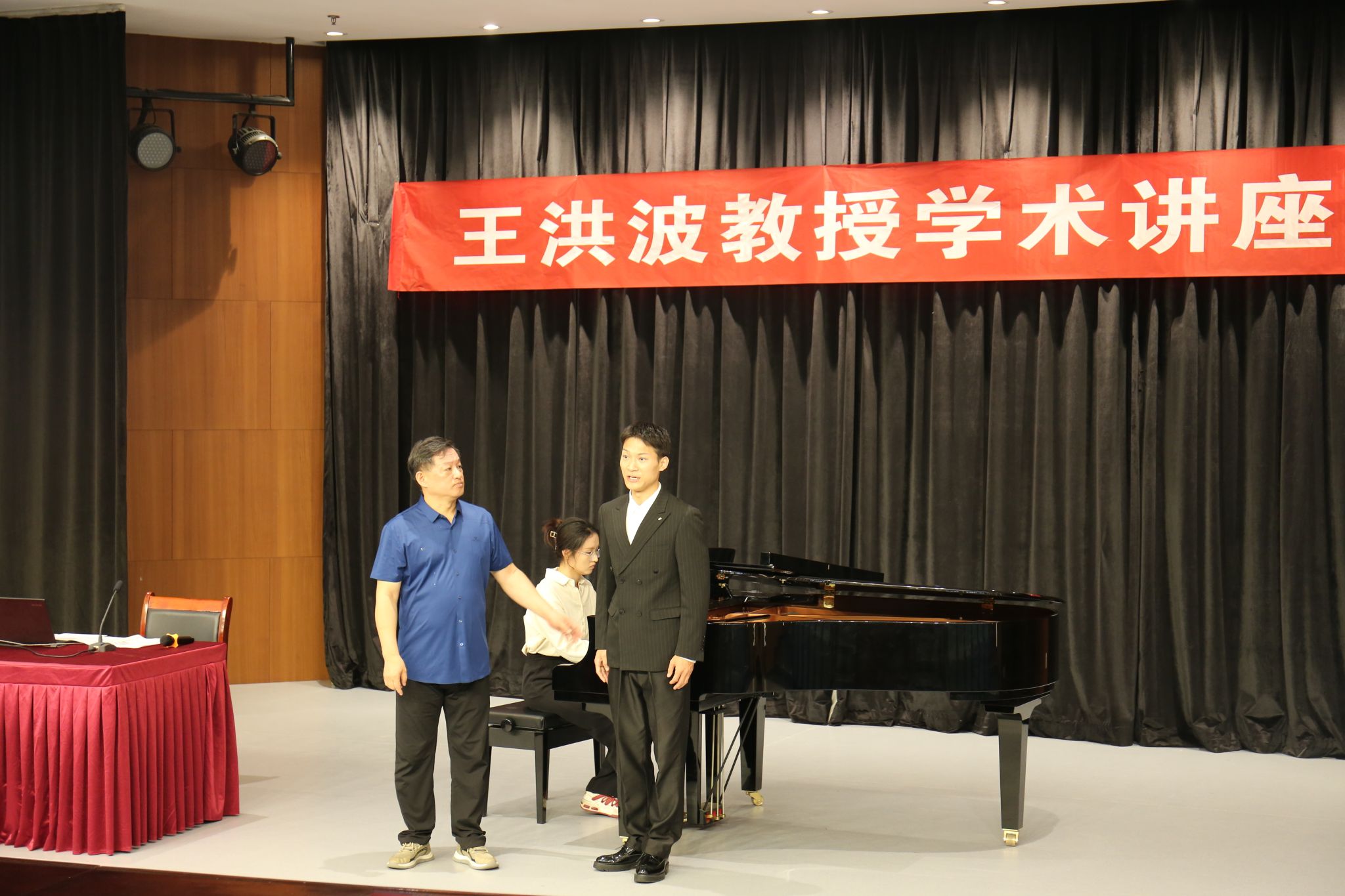 王洪波教授讲到声乐是一门高雅艺术,要有好的技术与方法,才能不断提高自身歌唱能力。他还提到想要唱好中国作品需要了解作品的创作背景,这样才能将作品的思想与情感表达出来。随后,他对上台演唱的同学们细心认真的指导,提出很多宝贵的意见与建议。