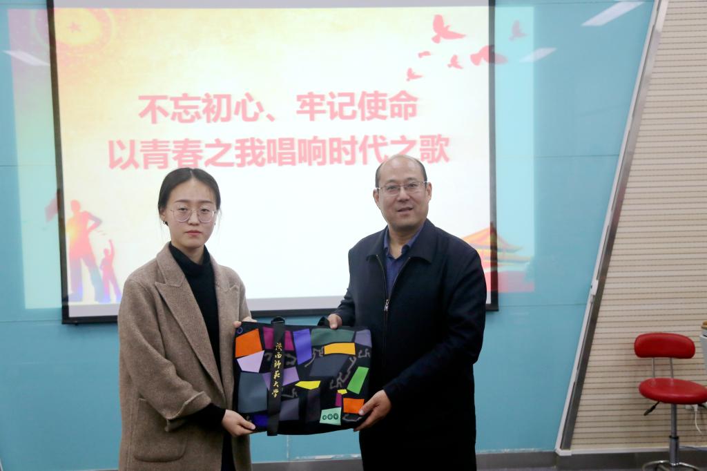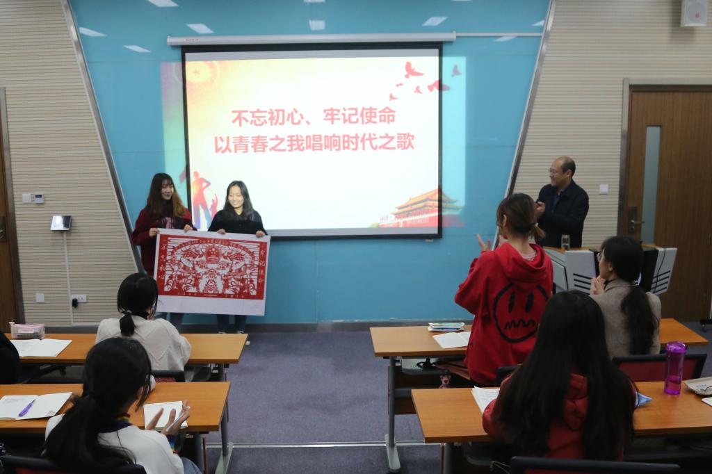 在课堂互动环节中,学院党委副书记范玮熠作为助教,引导在场同学积极提问,同学们分别就“在校期间如何践行西部红烛精神”、“在新的历史方位如何将五四精神融入学习与工作中” 、“如何快速补齐西部教育短板”等问题发出了青春之问,并在李磊的答疑解惑下更加明确了前进的方向和目标。随后,团支部书记李小湘向在场师生分享了同学们在我校“石榴籽”工作坊参与制作的“不忘初心 牢记使命”主题剪纸,并带领全班同学高唱校歌《桃李香满园》,用悠扬的歌声唱响师大人的初心和使命。