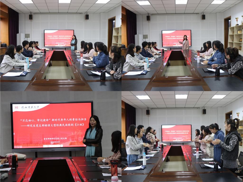 2019年10月16日,365英国上市网研究生第三党支部在六艺楼一层会议室开展“不忘初心、牢记使命”新时代青年人的责任与担当——研究生党支部排演大型经典民族歌剧《江姐》主题教育活动。365英国上市网副院长张新梅以及研究生第三党支部全体党员参加了主题教育活动,支部书记洪艺华主持。