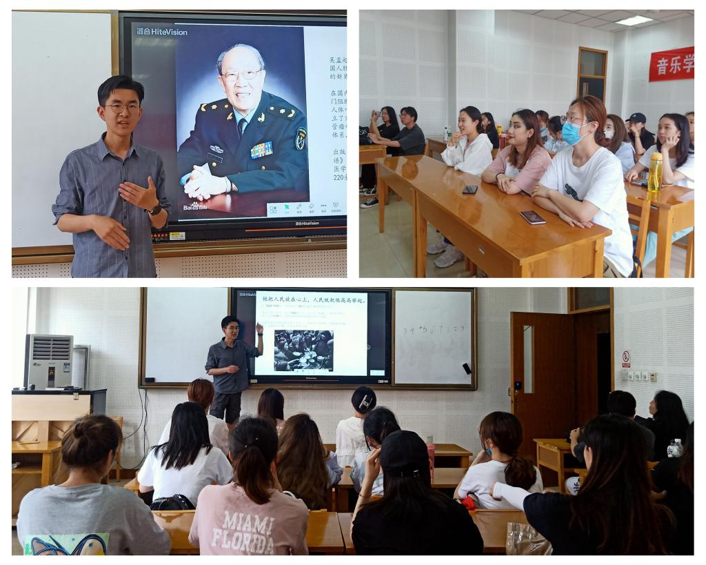 预备党员、2018级音乐表演专业本科生张京泰对袁隆平、吴孟超院士的逝世表示了惋惜,并以时间为线索,介绍了两位院士的生平事迹,在各自领域对我国乃至全世界作出的突出贡献,以及广大人民群众的崇敬。他还呼吁同学们共同学习和传承他们身上体现的无私奉献的伟大精神、坚定不移的人民立场、矢志不渝的钻研精神。