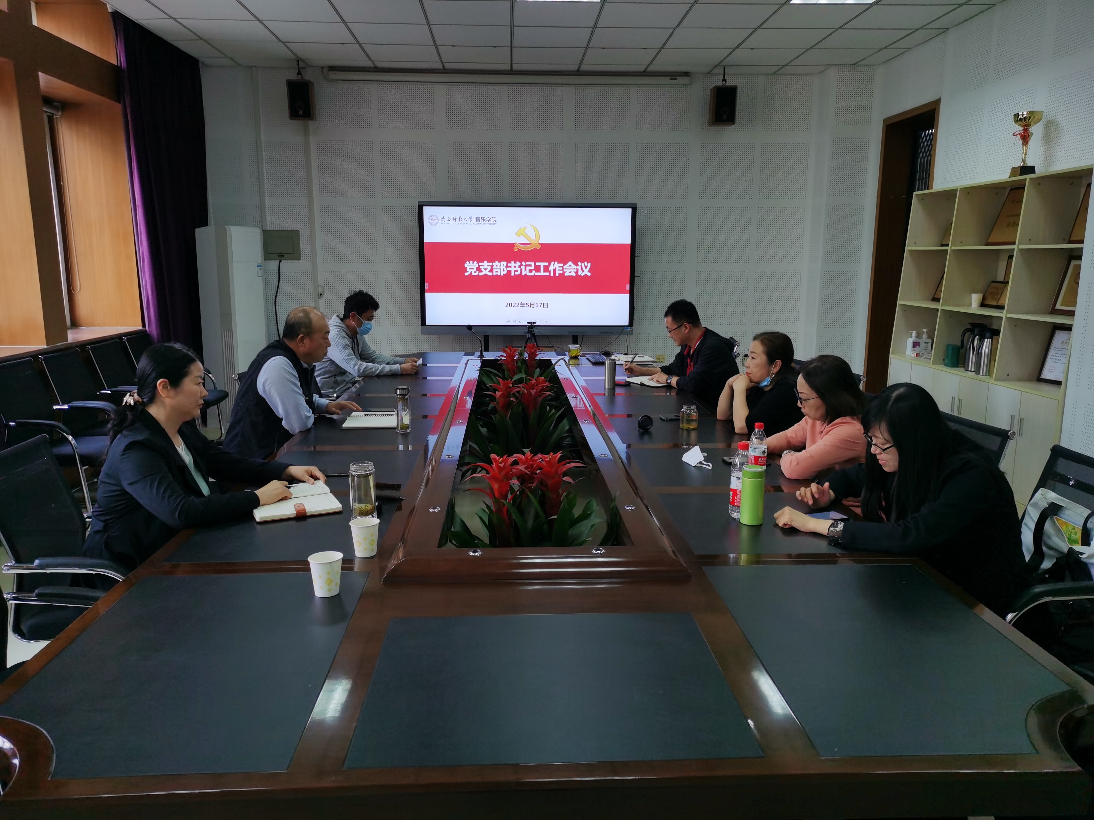 2022年5月17日14:30,365英国上市网教工党支部书记工作例会在学院一层会议室召开。学院党委委员、副院长张新梅、各教工党支部书记、院党委组织员吴小龙参加会议,会议由院党委书记杜炳志主持。