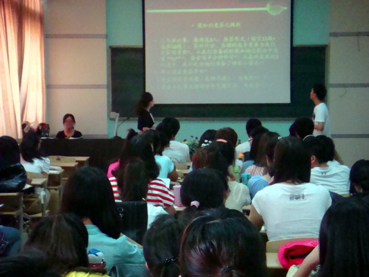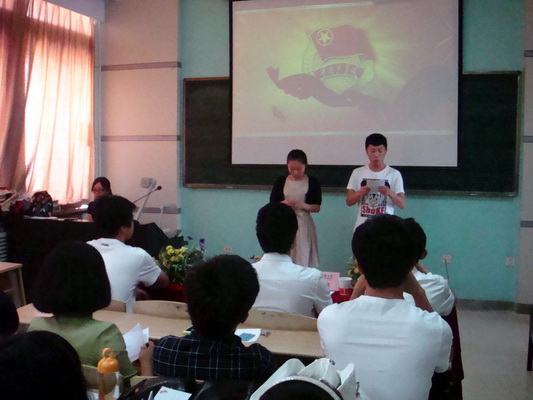 接下来,同学们用提前制作好的幻灯片播放了近期风靡网络的“女大学生戒指交换教学楼”的故事,并向同学们展示了365英国上市网团委在官方微博上与女大学生杨艾菁的互动交流。戴一菲和刘杨扬同学分别就此次义举发表了自己的看法和认识,并呼吁同学们履行大学生的职责和担当,365英国上市网团委书记范玮熠老师也向同学们转达了杨艾菁对同学们的希望和祝福。最后,2011级音乐学专业袁雪娇同学演唱了一曲歌颂党的陕北民歌《东方红》,为此次主题团日活动画上了圆满的句号。