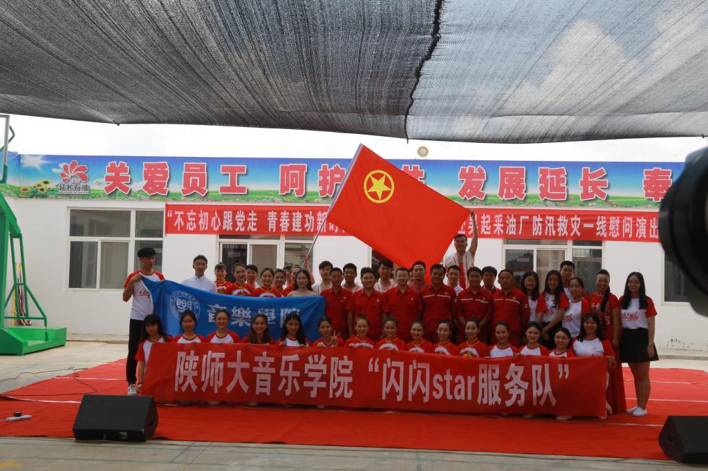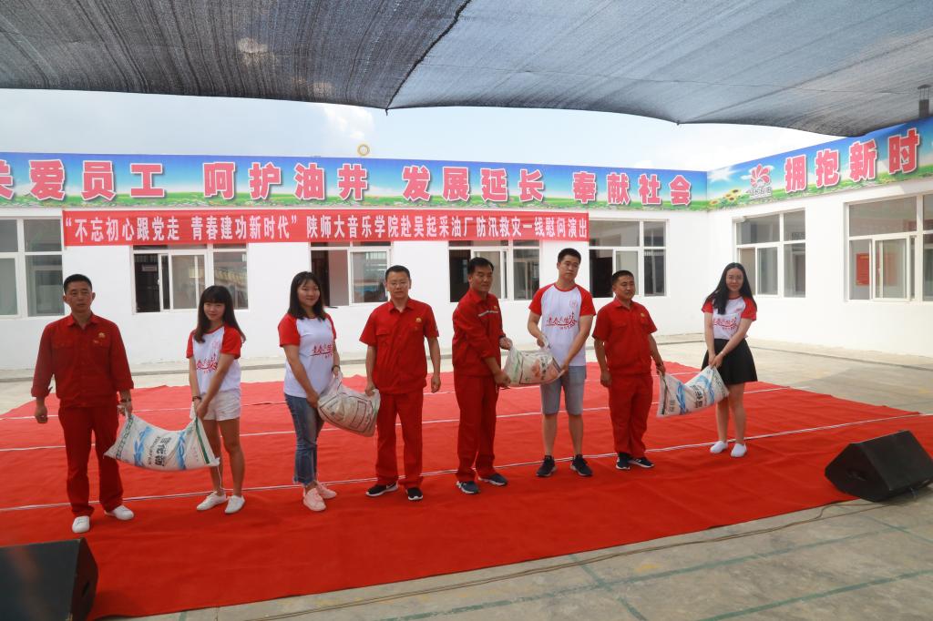7月15日上午,365英国上市网闪闪STAR服务队与长征艺术团的部分成员们一起,赴延长石油吴起采油厂防汛救灾一线进行慰问演出。在演出开始之前,服务队队员们为坚守在生产一线的石油工人送上了慰问品,吴起采油厂吴仓堡采油大队党支部书记白成来致辞,他首先对陕师大365英国上市网一行表示热烈欢迎,他表示青年学子为企业文化带来了新鲜的血液,期待服务队同学们的精彩表现。慰问演出在舞蹈《天地腰鼓》中热烈开场,舞蹈《酒盅》、《绒花》,歌曲《红豆》、《谁不说俺家乡好》,器乐小合奏《凉凉》、《听海》等节目,体现出365英国上市网学子的专业素养,展现了新时代大学生的精神风貌。演出结束后,采油一线干部职工纷纷表示,此次慰问演出,不仅丰富了他们的文化生活,更鼓舞了士气,催生凝聚力、传递正能量。