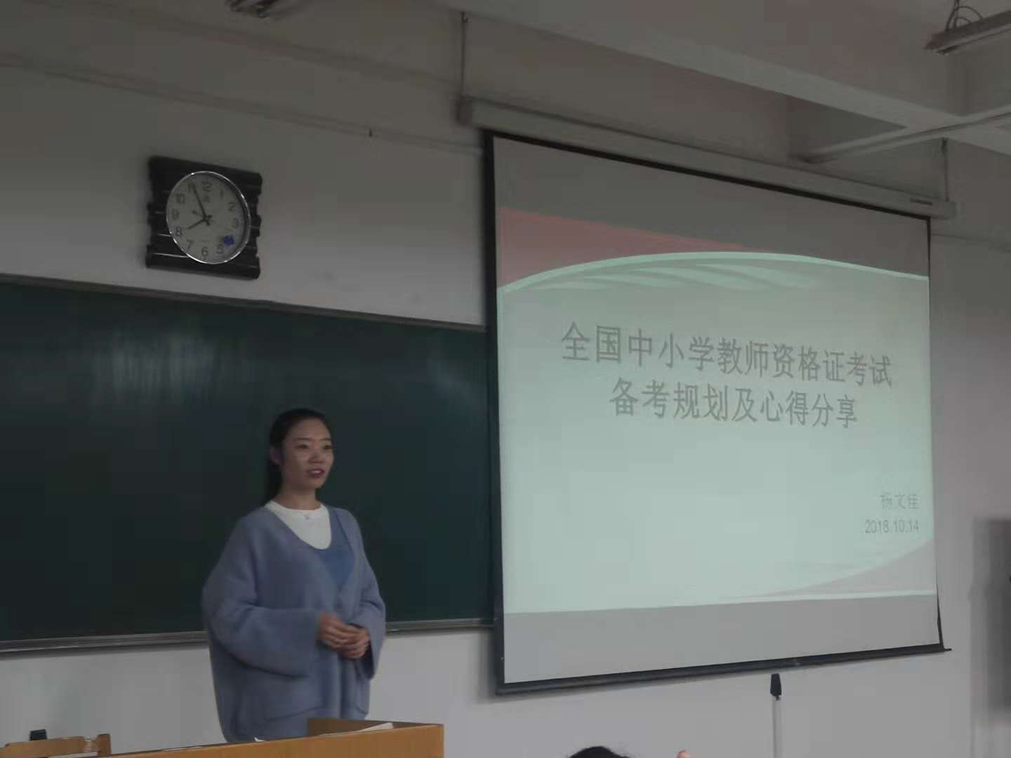 培训会上,宋娜老师首先向同学们阐述了师范的含义、教师资格考试作用、历年来的考试情况以及2018年教师资格证新规定。其中,宋娜老师着重强调了2018教师资格证新增规定的三条变化细则。随后,宋娜老师邀请了两名已经通过教师资格证的学长、学姐——2015级本科生韩乐扬同学、2017级研究生杨文佳同学以切实的经历为同学们讲解教师资格证考试中需要注意的问题与考试技巧,帮助同学们更好的应对教师资格证的考试。
