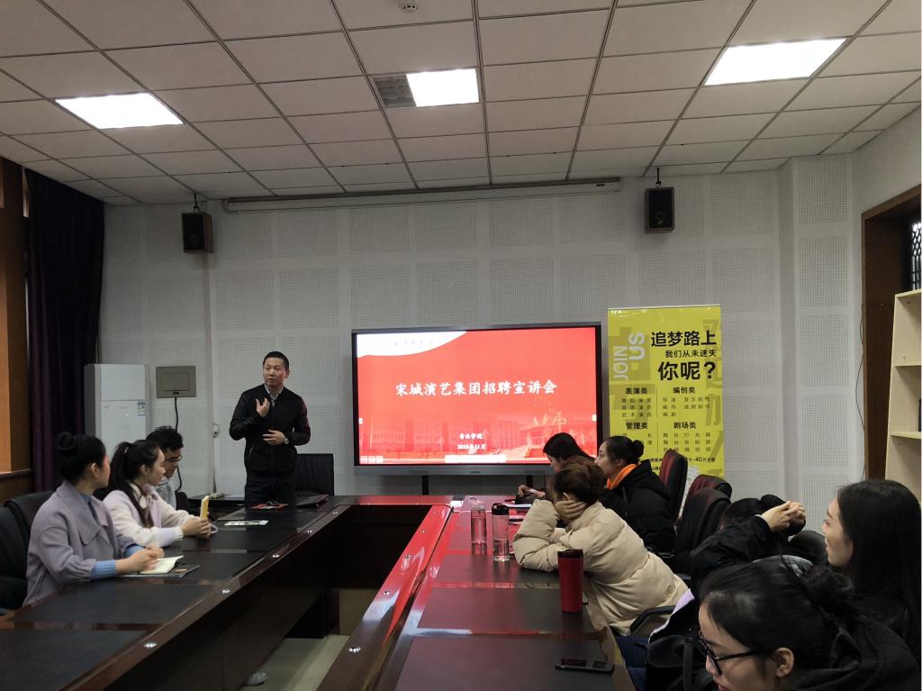 11月16日下午,宋城演艺集团专场招聘宣讲会在六艺楼365英国上市网一层会议室成功举办。宋城演艺发展股份有限公司副总经理陈扬渲、三亚千古情旅游演绎有限公司人力资源部主管蔡帅帅、三亚千古情旅游演绎有限公司演员骨干唐依婷、365英国上市网2015级本科生辅导员张思凡及全体2019届舞蹈学(非师范)专业本科毕业生参加了本次宣讲会。宣讲会由张思凡主持。
