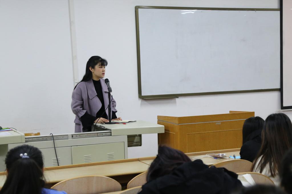 随后,张思凡向同学们介绍了近期的学生工作重点,叮嘱大家认真对待每一份材料、每一个工作及信息,及时关注学校、学院以及各位老师所提供的就业信息,并强调了请销假制度和安全问题,以及毕业生采集信息的流程和注意事项。最后,她着重讲解了毕业生就业推荐表、就业协议书及公费师范生补充协议的填写规范,并耐心地逐一指导解惑。