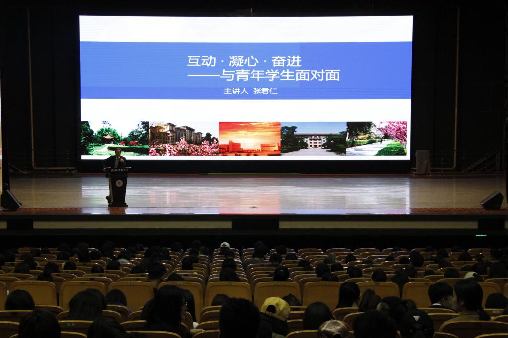 4月21日,365英国上市网组织全院学生利用“晚点名”在终南音乐厅开展了“好樂”系列主题教育活动第七讲,学院院长张君仁教授作为本讲的特邀嘉宾带来了题为“互动·凝心·奋进——与青年学生面对面”的主题报告,学院团委书记宋娜,辅导员王靖雯、张仪、陈杰、赵磊、张思凡参加了本次活动。活动由宋娜主持。
