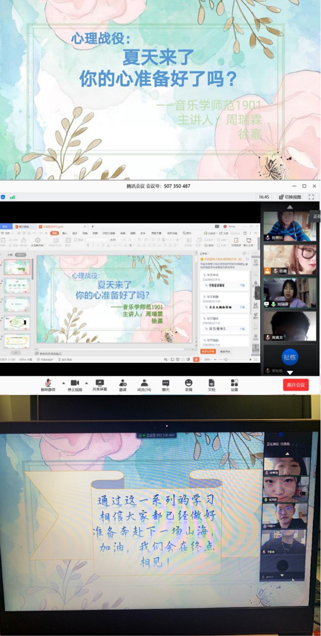 音乐学(音乐教育、音乐理论)专业以“给心加点油”为主题开展云班会,首先班长占淑敏带领同学们学习了心理健康相关知识,引导同学们在疫情期间要正视自己的情绪反应,保持健康积极向上的身心状态。接下来,围绕常见心理问题、心理健康判断标准、心理问题解决方法等多个方面展开了热烈讨论。