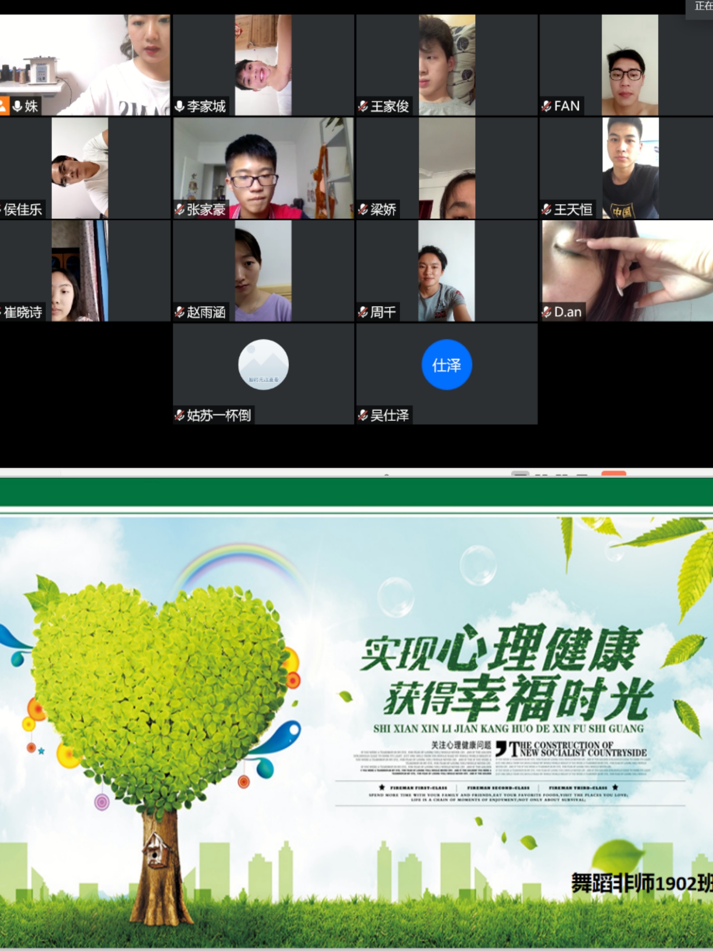 舞蹈师范一班围绕“”主题开展班会,班会第一环节是心理小游戏,心理委员组织同学们开展线上游戏,旨在活跃班会氛围,让同学们敞开心扉,放松心情。班会第二环节是学习心理小知识,通过学习心理健康知识,让同学们明白作为一名大学生应该懂得了解自我、关爱自己、接纳自己。班会第三环节是心理大防范,引导同学们增强心理保健意识,学会自我调节,树立理性平和、乐观积极的健康心态。舞蹈学师范班的同学们观看心理健康视频,帮助大家处理负面情绪。