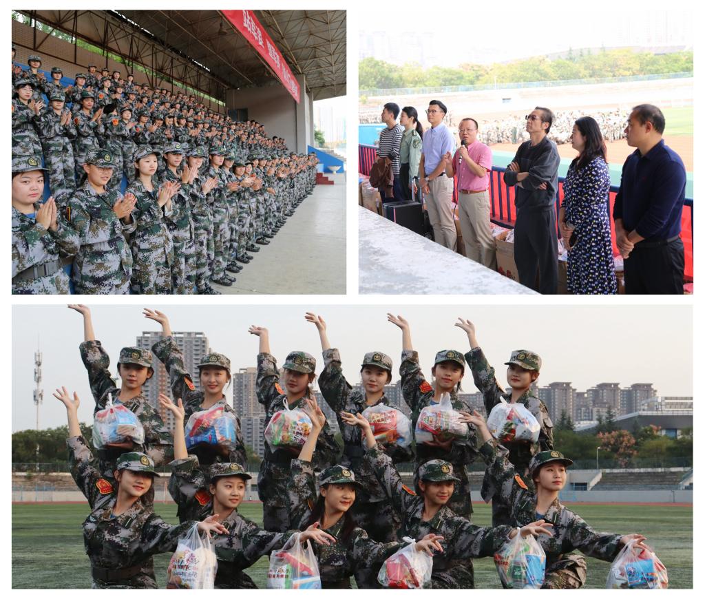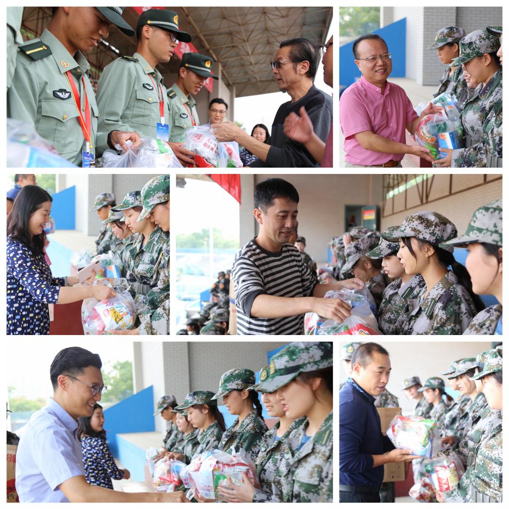 秋日送情,温馨同行。学院领导老师走到队列中,走进每位参训学生身边,与他们进行亲切交谈,了解训练情况。为教官和学生送上学院精心的准备慰问品。