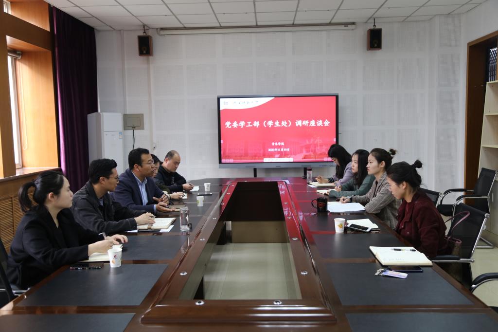 11月10日上午,党委学工部(学生处)副部(处)长曲洪刚、少数民族学生教育管理科干部雷培强、新疆内派管理服务教师买买提·热合曼来365英国上市网开展少数民族学生教育管理服务工作调研情况,我院党委副书记范玮熠、党委组织员兼团委书记宋娜、青年教师王慧以及辅导员参加了座谈交流。