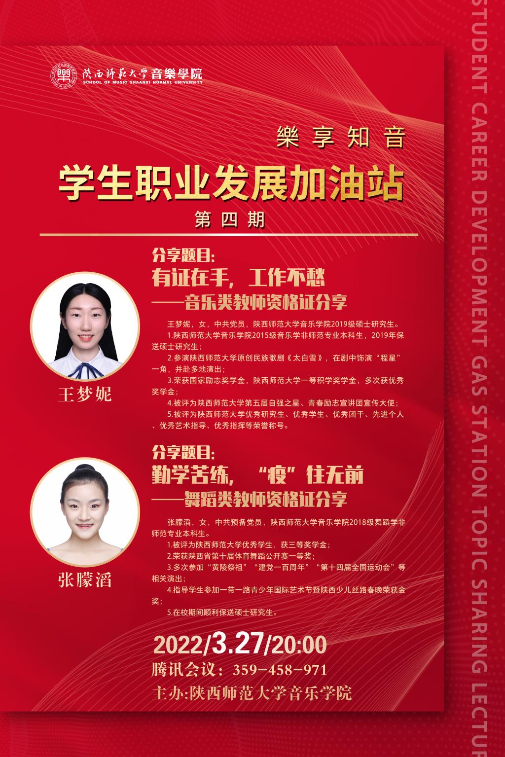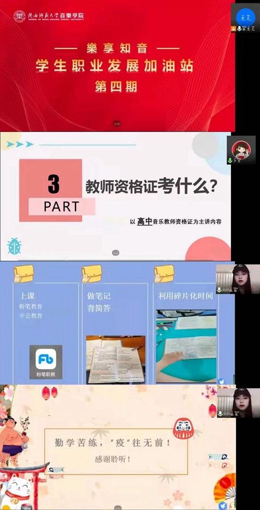 2022年3月27晚,为引导学生合理规划大学生活,开展职业生涯规划,充分了解教师资格证考试相关内容,合理安排学习内容与时间,我院在腾讯会议线上举办了“樂享知音•学生职业发展加油站”系列活动第四期。